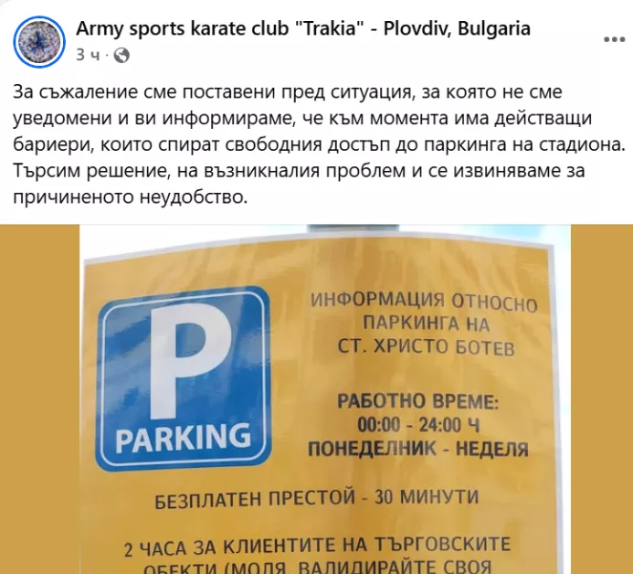 „ За страдание сме сложени пред обстановка, за която не сме известени и ви осведомяваме, че все още има настоящи бариери, които стопират свободния достъп до паркинга на стадиона. Търсим решение, на зародилия проблем и се извиняваме за породеното стеснение “, пишат във фейсбук страницата на клуба.