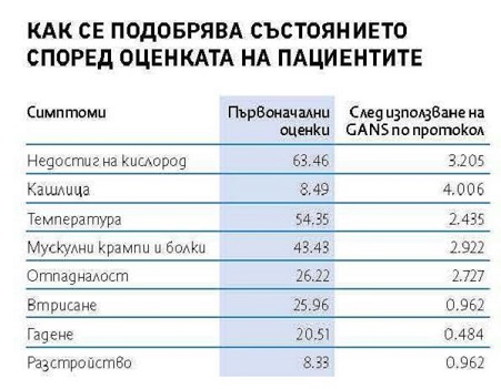 Резултатите, разказани в отчета, сочат, че 90% от болните са постигнали цялостно възобновяване от 3 до 7 дни, над 50% са имали усъвършенстване още в първите 48 часа, а някои пациенти с COVID-19 са се почувствали по-добре още след 3-6 ч. след използване на лекуването с GANS.