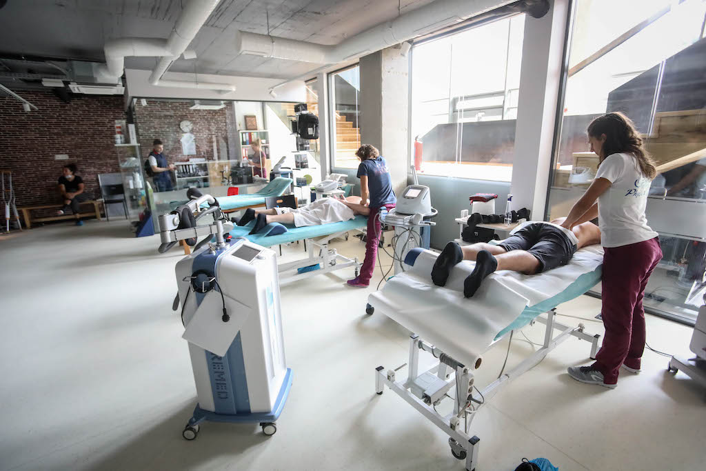 Залата, в която влизаме, е огромна и разграничена на обособени функционални кътове и кабинети. До всяка софа има друг апарат и всеки от пациентите е концентриран върху упражнението, което прави. Екипът е от осем души експерти в разнообразни области - някои се занимават с мануална терапия, други с акупунктура и сухи игли, а трети - със спортни разтривки. Петър споделя, че въпреки всеки да се е насочил в нещо, всички съблюдават обща методика и правила, а мотото им е: “Умният лекува заболяването, а мъдрият я предотвратява”. " Когато някой пристигна при нас с недоволство, първо го изпращаме на обзор при експерт. Работим с клиника Евровита, която има доста добър екип от ортопеди. Ако има потребност от мнение на невролог или неврохирург, насочваме пациентите към тях, и чак по-късно изготвяме проект за рехабилитация. Препоръчваме и периодически контролни прегледи, с цел да следим положението, и да знаем на какво равнище е всеки пациент. Внимаваме да не форсираме възстановителния развой и се отнасяме самостоятелно към потребностите на всеки. Повечето спортисти се вълнува от отговора на въпроса “колко време ще продължи рехабилитацията и по кое време ще мога да се върна на терен”, само че бързането води до неприятни резултати, и по тази причина съблюдаваме естествените периоди за възстановяване”.