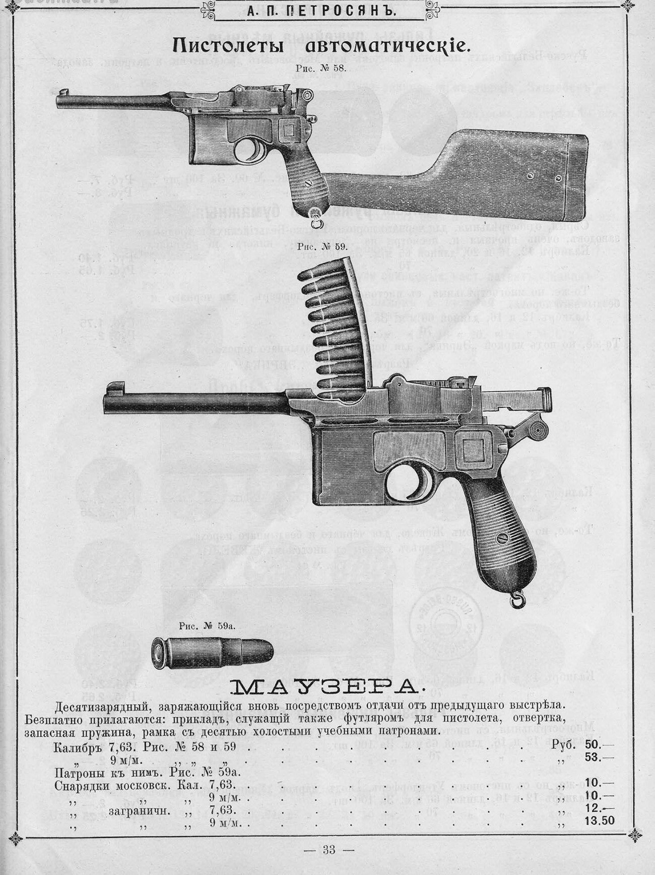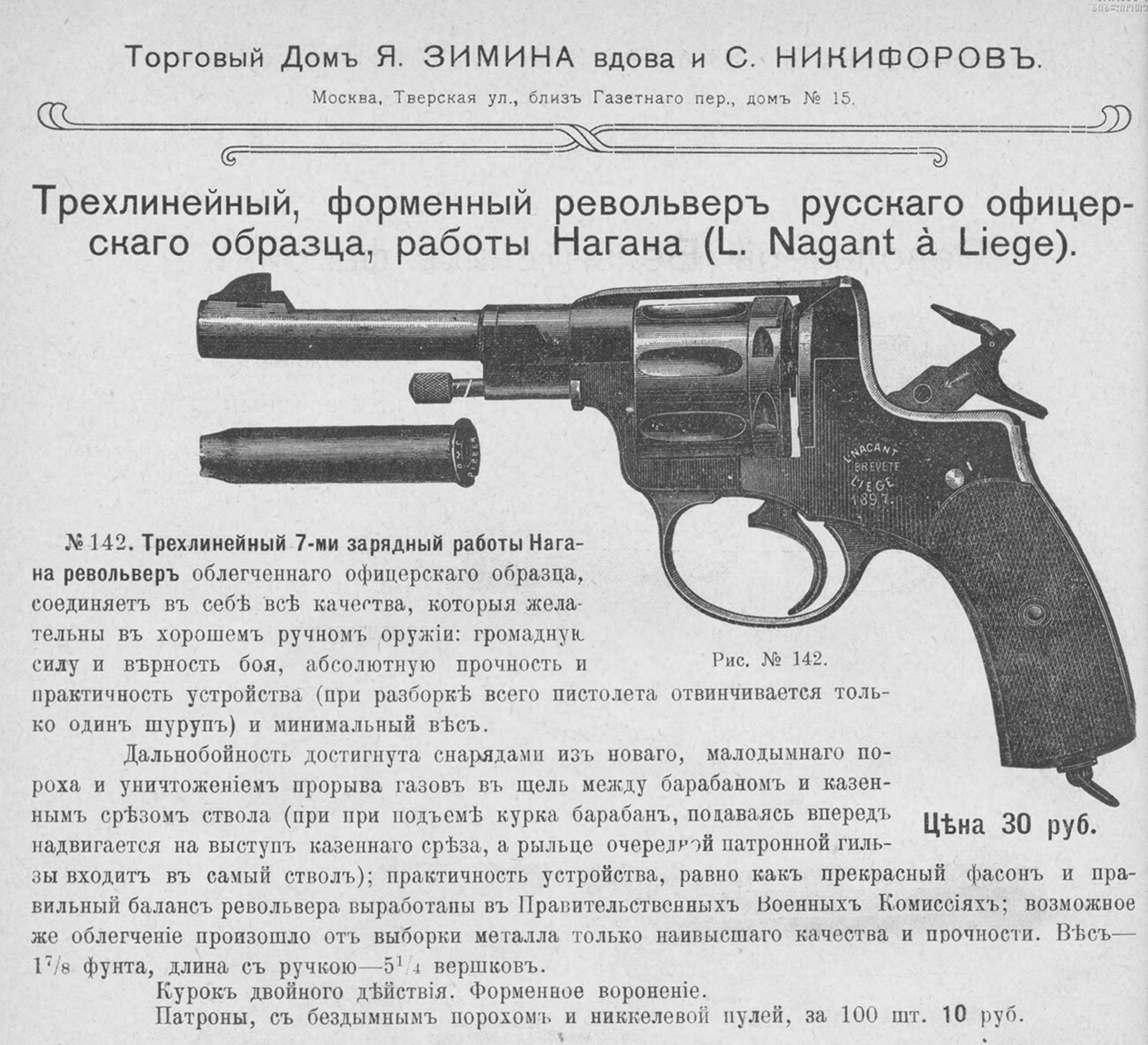 Свободни източници Рекламите за оръжие и брошурите от това време също подсказват, че притежаването на оръжие в Руската империя на границата на XIX и XX век не е нещо извънредно. Оръжията се продават дружно с други продукти, като спортни артикули и артикули за прилагане навън. Закупените оръжия могат да се изпращат на клиентите по пощата – способ за доставка, който през днешния ден е неразрешен.
