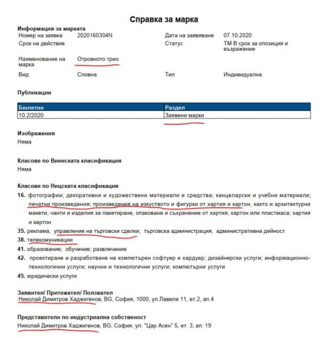 " Преди време споделих, че Отровното трио прави марка на гърба на митинга. Обвиниха ме, че си изобретявам. Ето какво открих във Патентното ведомство Скоро марката " Отровното трио " ще е реалност - патентована и подготвена за прилагане. " Това написа във Facebook профила си историкът Емил Соколов.