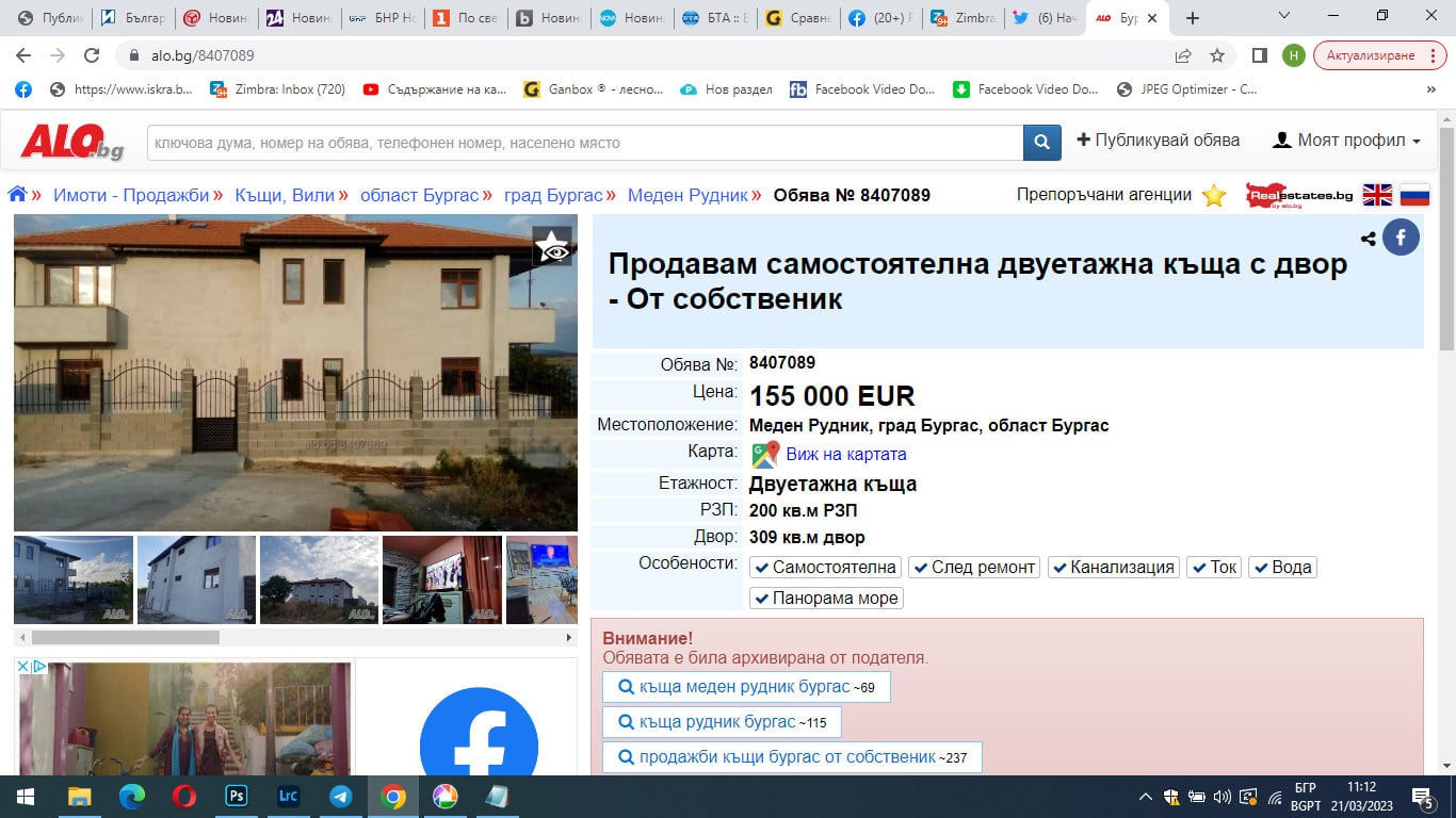 Тази къща е била оповестена за продажба . Обявата е била пусната в уеб страницата „ alo.bg “ . В нея е записано че парцелът се намира в „ Меден рудник “. Къщата е двуетажна с разгърната застроена повърхност от 200 квадратни метра , както и 309 квадратни метра двор. Нейните притежатели са я пуснали за продажба за сумата от 155 000 евро .
