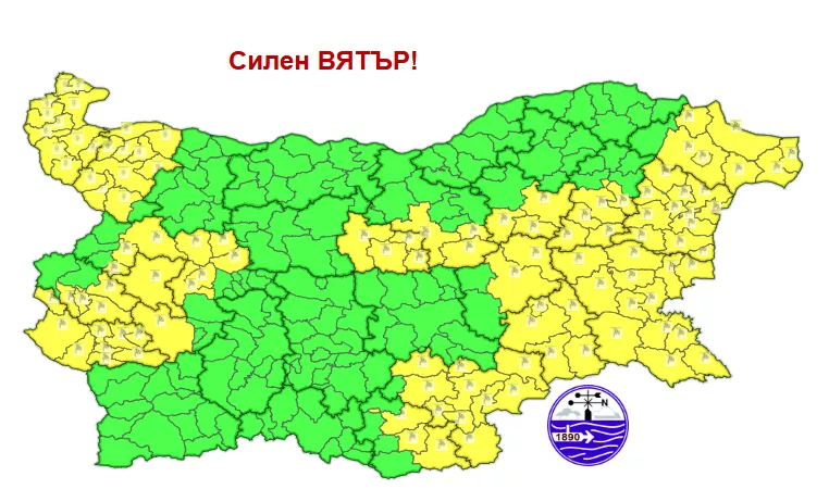 Жълт код за мощен вятър е разгласен за 15 области: области София-град, Област София, Перник, Кюстендил, Габрово, Велико Търново, Търговище, Шумен, Добрич, Варна, Бургас, Сливен, Ямбол, Хасково и Кърджали.