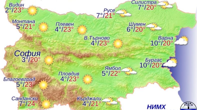 Ще духа слаб, в Дунавската низина и източните региони - сдържан източен вятър. Максималните температури ще са сред 19 и 24 градуса.