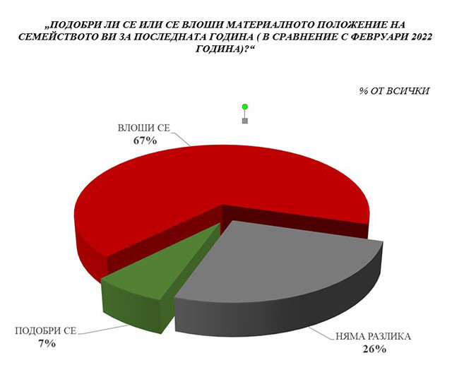 Изследването записва емфатичен скептицизъм подбуден от удара върху материалния стандарт на живот на огромна част от семействата (инфлационната рецесия от последните месеци). Над 60% регистрират утежняване на материалното си състояние в последната година, като болшинството показват, че в последните месеци им се постанова да пестят от задоволяването на съществени потребности – храна и отопление. Това е фонът, на който ще се проектира предизборната битка в идващия месец.