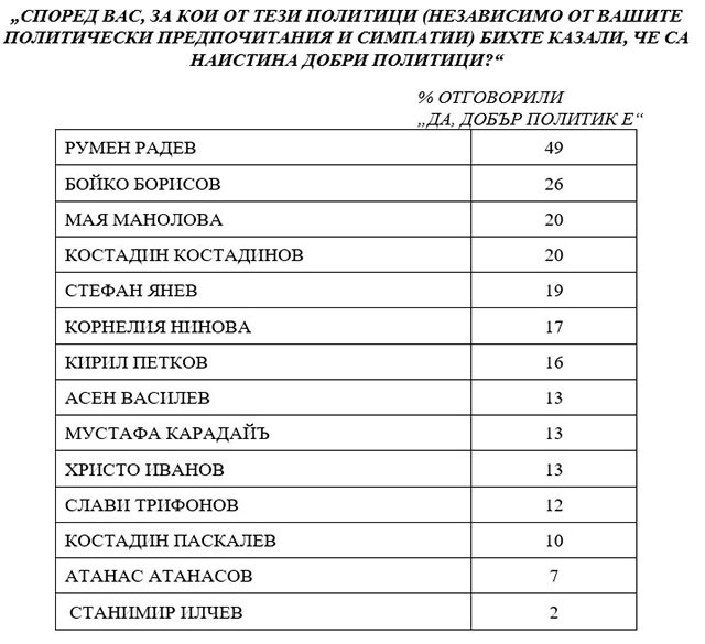 В рейтинга на политиците не се следят обилни разбърквания. По отношение на персоналните рейтинги, измежду водачите на партии Бойко Борисов продължава да е преди всичко, като повишаване бележи и Костадин Костадинов на „ Възраджане “. Спад в доверието се наблюдава при Корнелия Нинова и Атанас Атанасов.