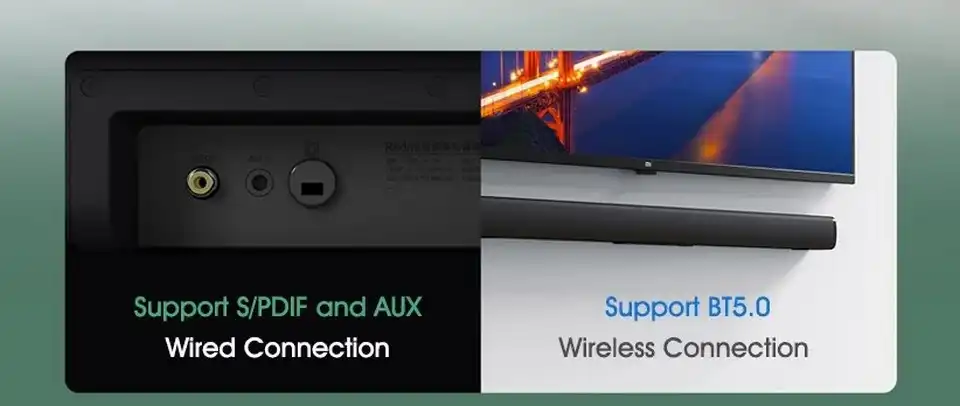 Първото най-важно нещо, което би трябвало да кажем за този саундбар, е опцията за кабелно и безжично свързване към тв приемника. Освен, че поддържа безжична Bluetooth 5.0 аудио връзка, моделът разполага с оптичен S/PDIF и AUX порт за кабелна връзка. Това значи, че можете да го употребявате на процедура с всеки тв приемник по желания от вас метод.