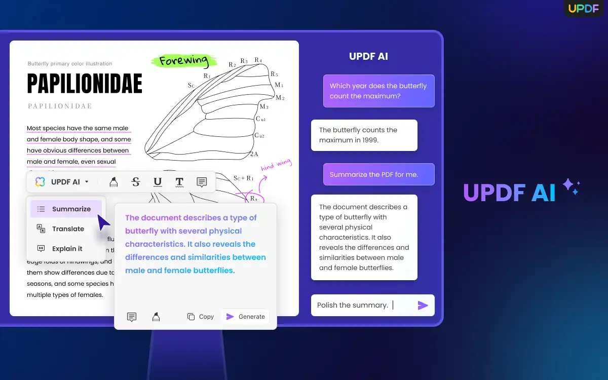 Но има една функционалност, която заслужава изключително внимание, а UPDF е един от дребното PDF редактори, които я оферират – това е AI на всички платформи. За да се възползвате от функционалностите на изкуствения разсъдък, UPDF AI първо ви кани да качите документа си в UPDF AI, преди да ви помогне по доста способи. Инструментът може да превежда текст на разнообразни езици, да извлича главните данни, с цел да напише обобщение, да изяснява избрани концепции или даже да генерира публикации, свързани с документа.