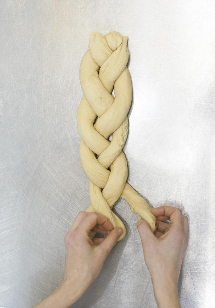 Тестото се оформя на три рула с дължина 40 см. Сплитат се на плитка.