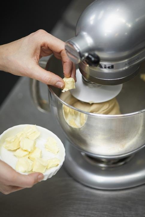 Увеличава се скоростта и се меси още 5 мин. Постепенно се прибавя маслото на късчета.