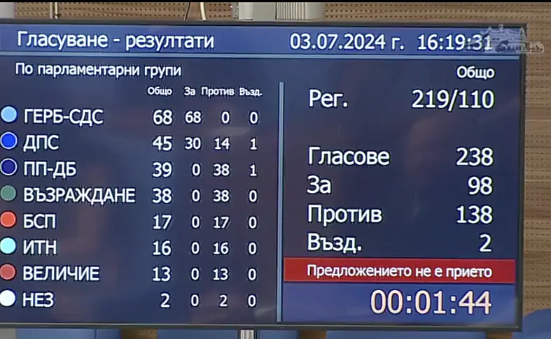 Предложеният проектокабинет с мандата на ГЕРБ-СДС и номиниран за министър председател Росен Желязков не мина гласуването в Народното събрание. 98от депутатите гласоподаваха “за ”, 138 “против ”, а 2 “въздържал се ”. Необходима беше поддръжката на най-малко 121 депутати, с цел да мине гласуването за Народното събрание.