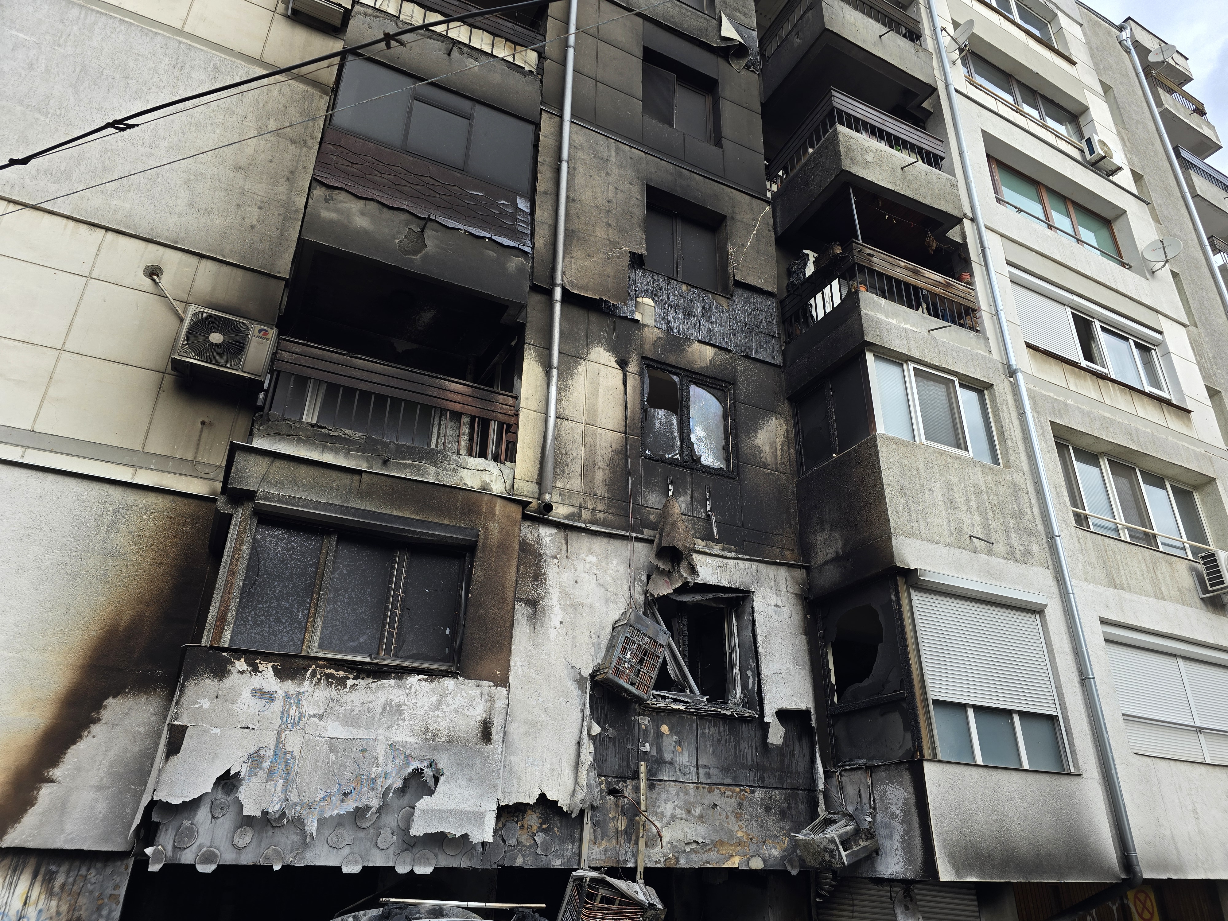 Нанесени са и съществени материални вреди – има избити прозорци, паднали климатици и опожарени коли.
