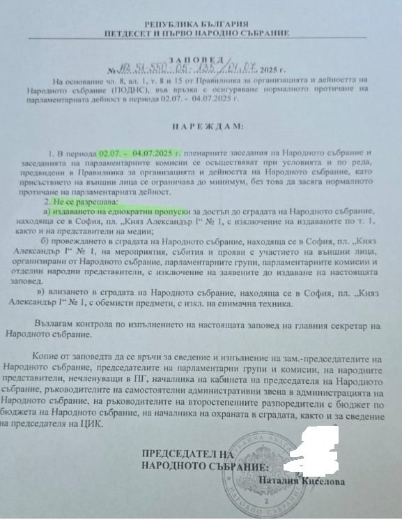 Председателката на Народното събрание Наталия Киселова е издала заповед на 1 юли, с която лимитира достъпа и стяга досегашния режим на влизане в някогашния Партиен дом, считано от 2 до 4 юли. Според нея външни лица няма да се позволяват, като се изключи депутати, министри, личен състав и медии. Това излиза наяве от разпореждането ѝ, клише от която разгласява в профила си в обществената мрежа общинската съветничка в СОС Ваня Григорова, която напусна групата на Българска социалистическа партия.