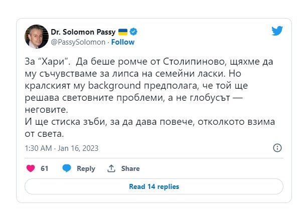 Председателят на Атлантическия клуб в България доктор Соломон Паси разяснява иронично в туитър автобиографичната книга на Принц Хари.