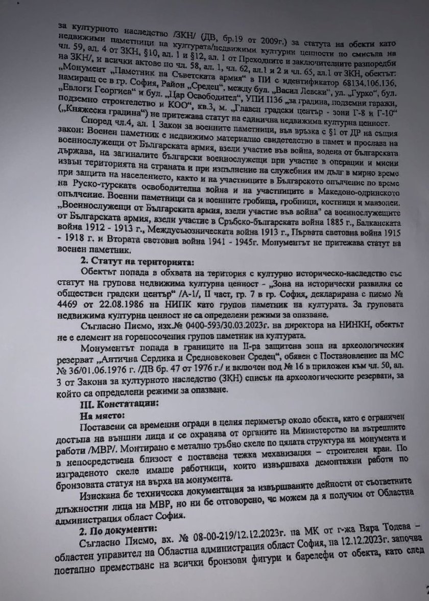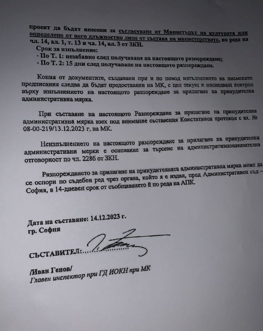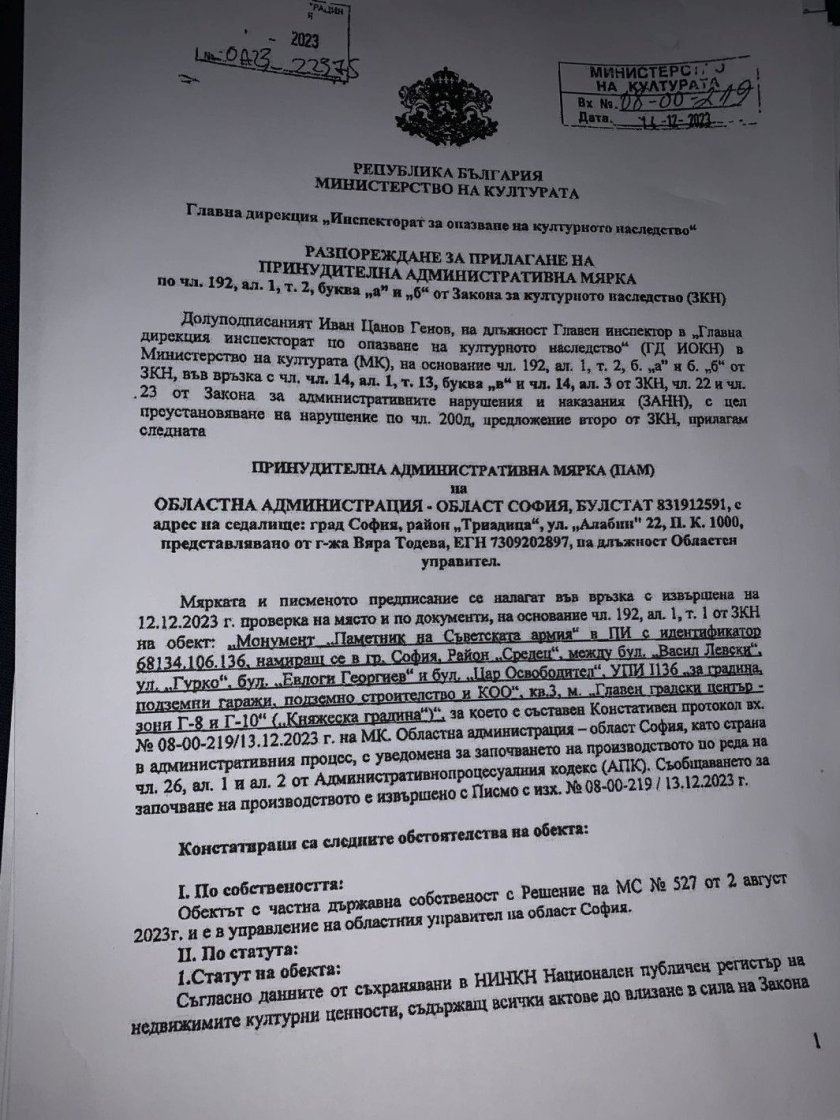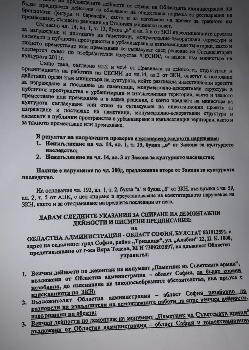От изпратения до медиите документ излиза наяве, че на 14 декември от Главна дирекция " Инспекторат за запазване на културното завещание " (ГД ИОКН) към Министерство на културата са разпоредили да бъдат спрени всички действия по демонтажа на паметника. Документът е подписан от основен контрольор Иван Генов. С него е наложена насилствена административна мярка, за която законът планува авансово осъществяване, т.е. още в четвъртък е трябвало да бъдат прекъснати всички действия по рязането на монумента, разяснява Иван Таков.