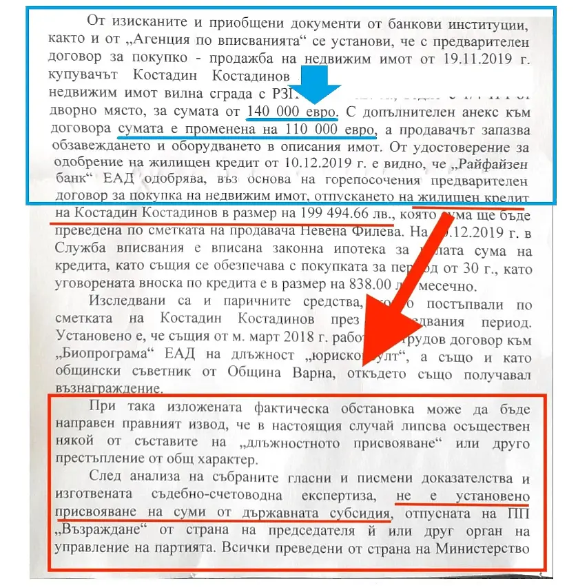 Любопитна детайлност за къщата наКостадин Костадиновсе открива в негова обява във Facebook. В нея той се хвали с разпореждане на заместител окръжния прокурор на Варна Дияна Иванова, с което тя е прекратила наказателно произвеждане против него. От постановлението обаче научаваме, че прокуратурата е открила съществуването и напредварителен договорза къщатана по-висока контрактувана ценаот140 хиляди евро/273 816.20 лева./. Предварителният контракт е бил показан в банката за разпределяне на заема.С допълнителенанекскъм контракта сред Костадинов и продавачасумата е изменена на 110 хиляди евро/215 141,30 лева./, а “продавачът резервира обзавеждането и оборудването ”.Разликата е 30 хиляди евро.
