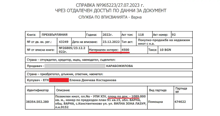 За договорката споделя. Информацията била проучена и тествана от медията в Имотен указател, в Кадастъра, както и в наличната на формалния уебсайт на Община Варна информация. От съобщение на общината се схваща, че за парцела е правенаобстоятелствена проверказа ПИ ид. № 38354.502.280, поискана посредством прокурист от Росица Карабожилова. Това е станало през есента, след което на 19.12.2022 година на Карабожилова е публикуван констативен нотариален акт по обстоятелствена инспекция. Дни по-късно, тъкмо преди Коледа, на 23.12.2022 година Росица Карабожилова продава имота наЕленка Костадинова–майка на Костадин Костадинов. Имотът е прилежащ накъщатана Костадинов.