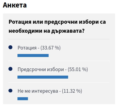 55 на 100 от участниците споделят, че българинът би трябвало да гласоподава за нови ръководещи, вместо още веднъж да се довери на настоящия нетрадиционен метод на ръководство на двете най-големи обединения в Народното събрание. Според тях контрактуваната още преди девет месеца ротация няма да сработи за решение проблемите на страната ни.