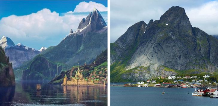 Пейзажът е взет от селските градове на Норвегия и неговите превъзходни фиорди. Можете да видите приликата в естествените пейзажи, дървените църкви, тухлената архитектура, текстилните шарки и даже животните (помислете за Свен). Защо? Защото историята е въодушевена от датския създател Ханс Кристиан Андерсен „ Снежната кралица “. Така че наподобява напълно естествено, че Майкъл Джаимо, арт шеф на Замръзналото кралство, пътува до Скандинавия, с цел да търси ентусиазъм.