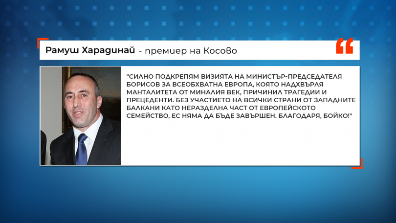 В тематиката се включи косовският министър председател Рамуш Харадинай, който в статус във Facebook, благодари на Борисов за кардиналната позиция. Той написа, че твърдо поддържа визията му за всеобхватна Европа, която надвишава манталитета от предишния век, предизвикал нещастия и прецеденти. Според него без присъединяване на всички страни от Западните Балкани Европейският съюз няма да бъде приключен. И добавя, че взаимното признание със Сърбия на съществуващите граници ще им даде по-богати вероятности.