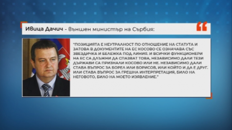 Дачич прикани за точност при сходни изявления. И посочи, че позицията на Европейски съюз за независимостта на Косово е неутрална и всички в Общността са длъжни да съблюдават това, без значение дали страните им са признали Косово или не и без значение дали става въпрос за Борел или Борисов. Дачич позволява, че може да става въпрос за неверна интерпретация.