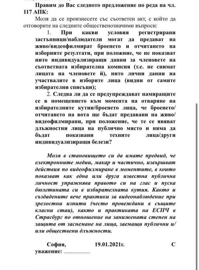 - при отварянето на изборните урни, броенето на бюлетините и попълването на протоколите, без да се снимат лицата и индивидуализиращи данни на членовете на изборните комисии, се предава " онлайн " в интернет този развой във всяка секция;