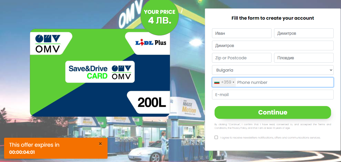 По пътя попълнихме подправени данни, до момента в който стигнем до последната стъпка, а от самото начало броячът отброява от 5:00 мин. до 0, за да сме по-бързи и да не мислим, че е машинация. През това време горе в дясно излизат едно след друго известия по какъв начин един си кой, одеве е закупил картата и ни подтиква да бързаме, с цел да не изпуснем „ офертата”. Естествено оферта няма и въведем ли данните от картата си, към този момент сме се хванали на въдицата.