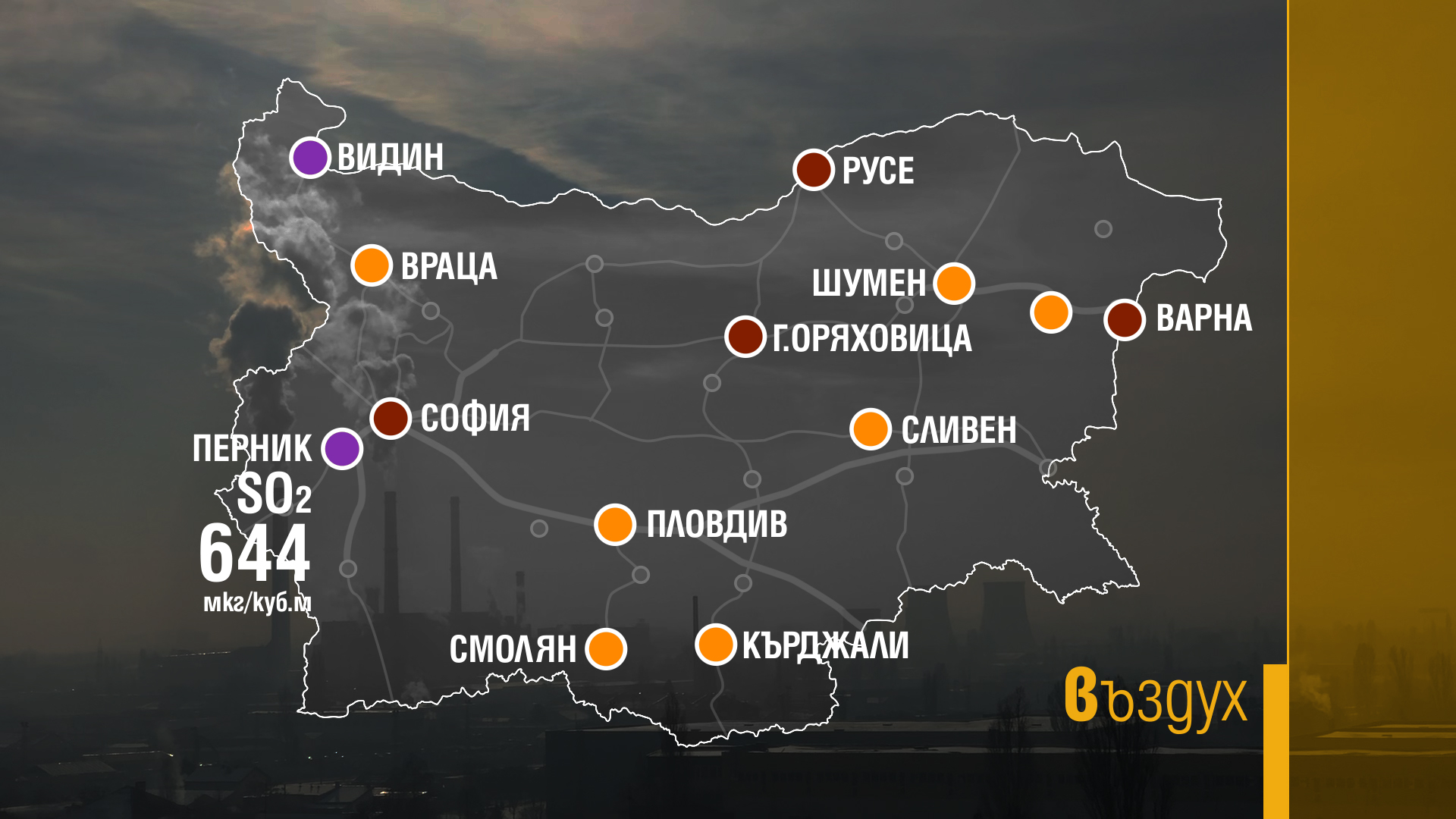 Заради неналичието на вятър и мъглите въздухът в страната продължава да е нечист. Над 10 са станциите, които рано тази заран регистрират централизация на фините прахови частици над нормите. Най-тежко се диша във Видин, Русе, Горна Оряховица, София и Варна. В Перник през нощта още веднъж има висока централизация на серен диоксид. В 21 часа нощес цената е била 644 микрограма на пространствен метър (при оптималната среднозасова норма 350).