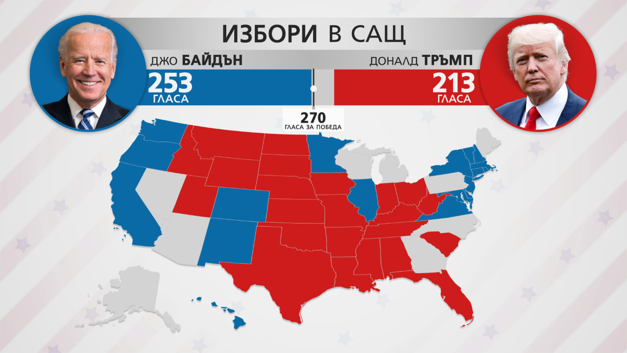 По последни данни Джо Байдън е спечелил 253 електорални гласа, а Тръмп – 213.