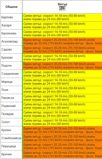 Предупредителeн жълт и оранжев код е разгласен за мощен вятър през днешния ден. Вятърът ще е от юг-югозапад с пориви до 32 m/s. От страницата за рискови феномени на Национален институт по метеорология и хидрология излиза наяве, че при жълт код за мощен вятър има заплаха от летящи във въздуха предмети. По тази причина са вероятни местни нарушавания на нормалните действия навън.