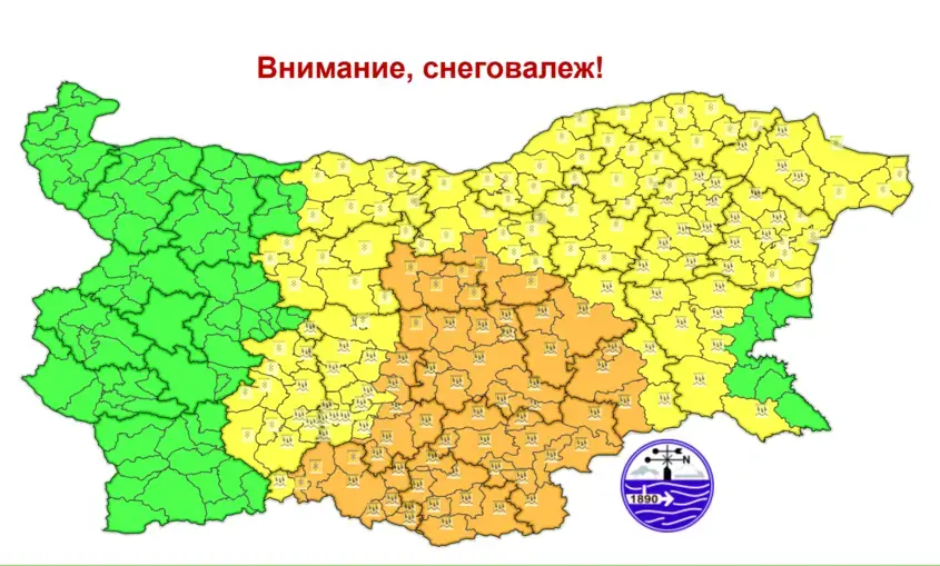 Оранжев код за мощен снеговалеж и виелици е разгласен в 9 области в Централна и Северна България. По-ниската степен на предизвестие за превалявания и снегонавявания - жълт код е в действие за други 11 области в Северна и Източна България.