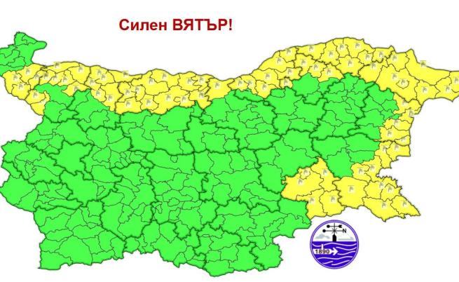 Предупреждение от първа степен – е издадено за 12 области в България за мощен вятър, сочи информация в уеб страницата на Национален институт по метеорология и хидрология. Кодът е в действие за областите: Видин, Монтана, Враца, Плевен, Велико Търново, Русе, Разград, Силистра, Добрич, Варна, Бургас и Ямбол .