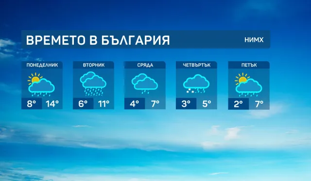 В четвъртък минималните температури ще са сред 0 и 5°, а оптималните – сред 3° и 8°. Ще бъде най-вече облачно, с превалявания от дъжд, в планините – от сняг. В петък и събота малко ще се затопли и преваляванията в по-голямата част от страната ще спрат.