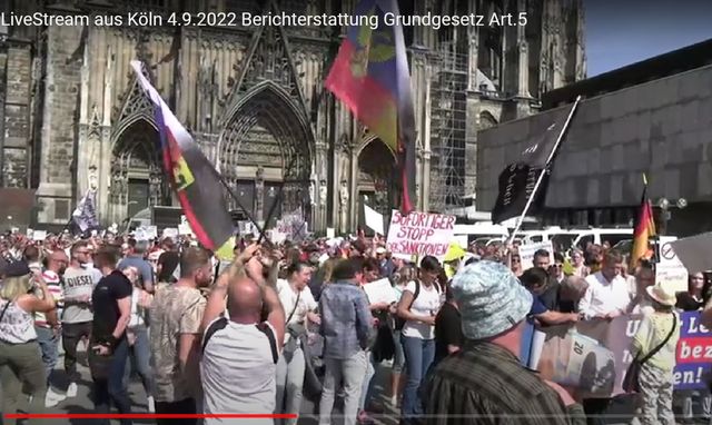 Митинг в поддръжка на Русия в Кьолн. 04.09.2022. Цитат от видеото ``Livestream aus Koln 04.09.2022 Bericherstattung Grundgesetz Art.5`` на потребителя Michel Wittwer 2.0