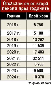 През последните девет години, откогато хората получиха право да се отхвърлят от вторите си пенсии, това са създали 112 497 души, демонстрират данните на Национална агенция за приходите, която събира осигурителните вноски. Същевременно единствено 3743 души са се възползвали от правото си още веднъж да преминат от напълно държавна пенсия на разновидността на държавна пенсия и втора от частен повсеместен фонд. Така действително над 108 хиляди души са решили, че избират да получават единствено една държавна пенсия. Като в тези данни не влизат работещите в условия на първа и второкласен труд, които са се отказали от частния си професионален пенсионен фонд.