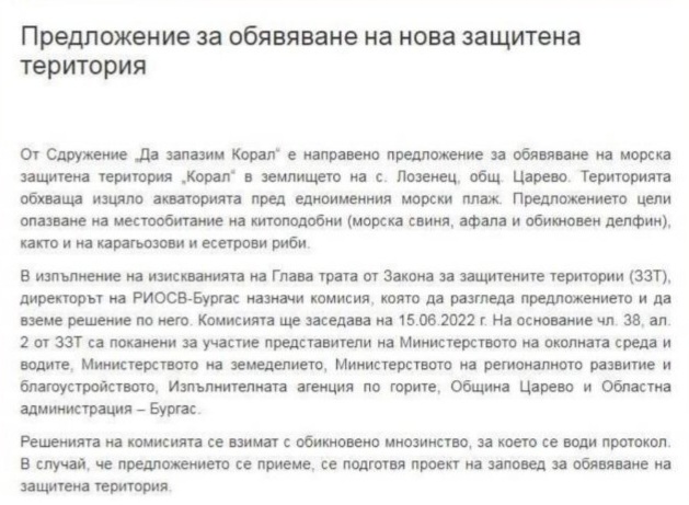 В осъществяване на заповедта на вицепремиера по климата Сандов, директорътъъ на Регионална инспекция за опазване на околната среда Бургас привиква на 15 юни 2022г. комисия, която да одобри предлагането за оповестяване на морската територия пред плажа Корал за предпазена.