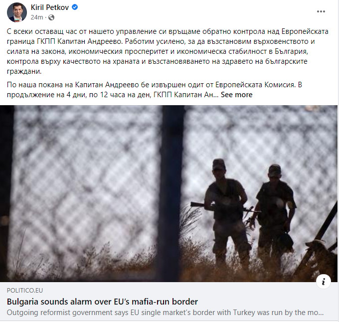 “С всеки оставащ час от нашето ръководство си връщаме назад контрола над Европейската граница Граничен контролно-пропусквателен пункт “Капитан Андреево”. Работим интензивно, с цел да възстановим върховенството и силата на закона, икономическия разцвет и икономическа непоклатимост в България, контрола върху качеството на храната и възобновяване на здравето на българските граждани”, написа Петков в своя Фейсбук профил.