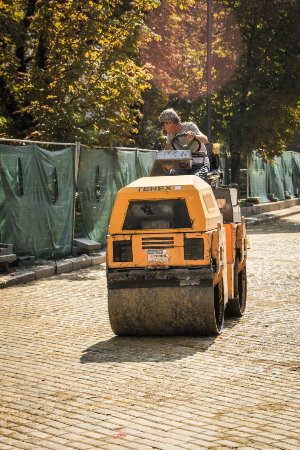 " В момента се прави фугиране, уплътнява се с дребни валяци пренаредения сектор и се полива с вода. Изпълнява се пренареждане на паважната настилка.