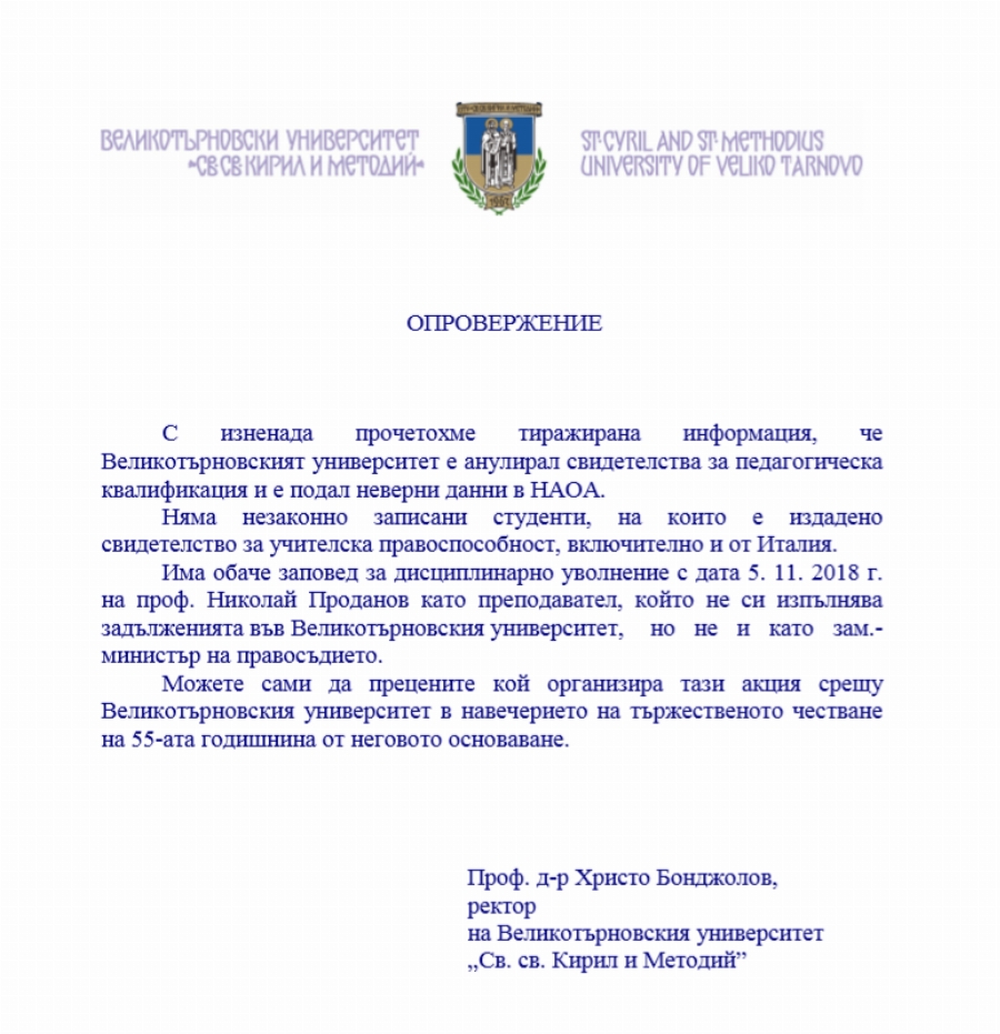 На уеб страницата на Великотърновския университет " Св. Св. Кирил и Методи " е оповестено известие, подписано от ректора проф. доктор Христо Бонджолов, в което се споделя следното: