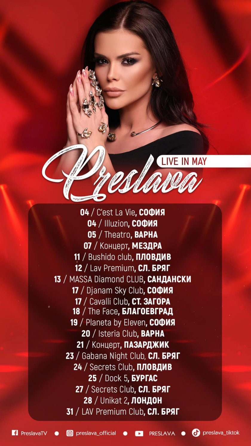 Преслава е същинска работна пчеличка. През месец май звездата на „ Пайнер “ има 19 публично оповестени участия и ще пее на няколко частни празненства. Хонорарът й за изяви е 8000 лв., а за персонални празници стига до 10 бона.