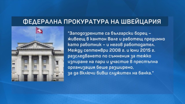 „ Заподозрените са български герой, живеещ в кантон Вале и работещ най-вече като служащ, и негов шеф. Между септември 2008 година и юни 2015 година следствието по подозрения за тежко изпиране на пари и присъединяване в незаконна организация беше разширено, с цел да включи някогашен чиновник на банка “, споделят от прокуратурата.
