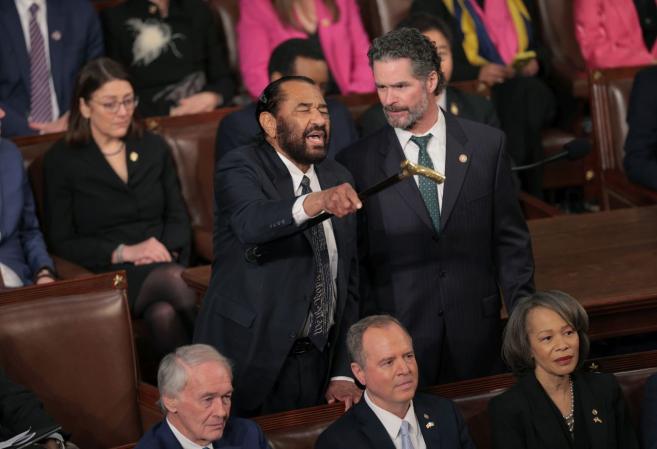 Грийн, който от дълго време упорства за импийчмънт на Тръмп, датиращ от предходния му мандат, стана и насочи бастуна си към президента в първите минути на речта му.