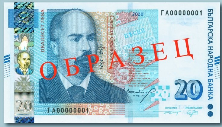На лицевата страна на банкнотата от 20 лв. са изобразени портрет на Стефан Стамболов, откъс от негова авторска стихосбирка и щемпел на Българския благотворителен комитет „ Единство “. На гърба виждаме постройката на Народното събрание, фрагменти от Орлов мост и Лъвов мост.