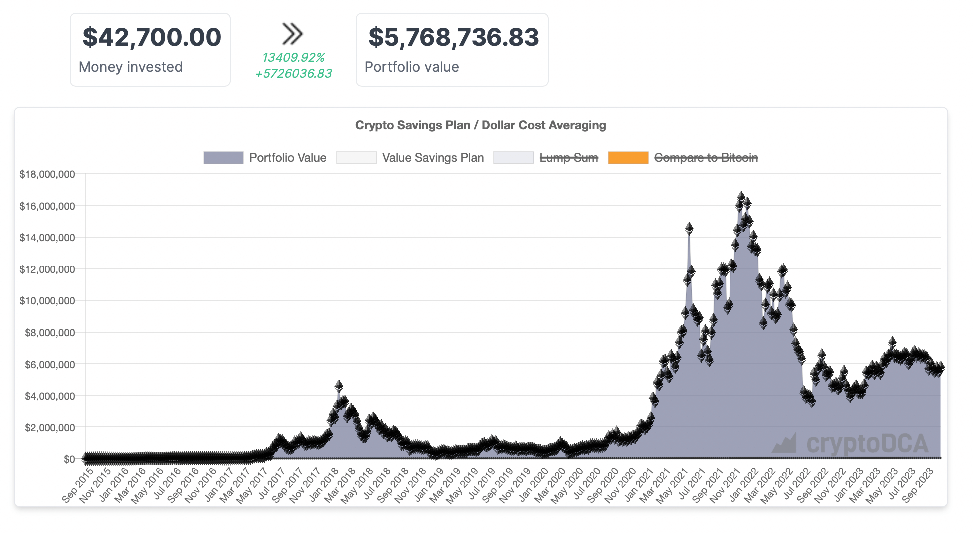 Ако бяхте вложили поредно по $100 всяка седмица от 2015 година насам и бяхте траяли да го вършиме, до момента в който Ethereum (ETH) доближи своя връх, щяхте да сте внесли $33,000. Стойността обаче щеше да се повиши до впечатляващите $14.24 милиона, което значи растеж от 43,056%.