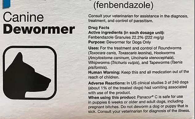Ветеринарният лекар описа на Джо за фенбендазол (на снимката), лекарство за обезпаразитяване на кучета, което сподели свойства за битка с рака в клетъчните проучвания.