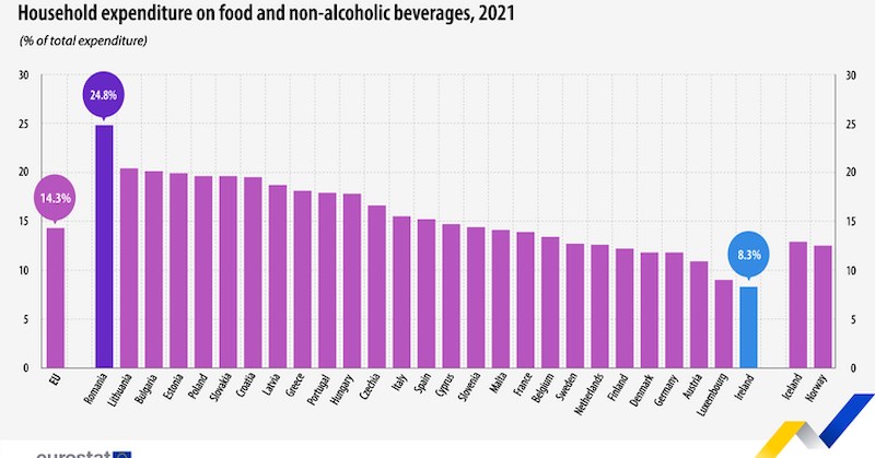 Най-високите разноски за храни и безалкохолни питиета през 2021 година са регистрирани в Румъния (24,8 на сто), Литва (20,4 на сто), България (20,1 на сто), Естония (19,9 на сто), Полша и Словакия (по 19,6 на 100 и в двете страни).