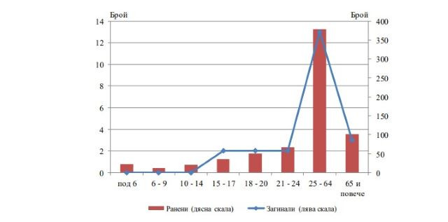 Фиг. 1. Загинали и ранени при пътнотранспортни катастрофи в област Варна през 2021 година по възрастови групи