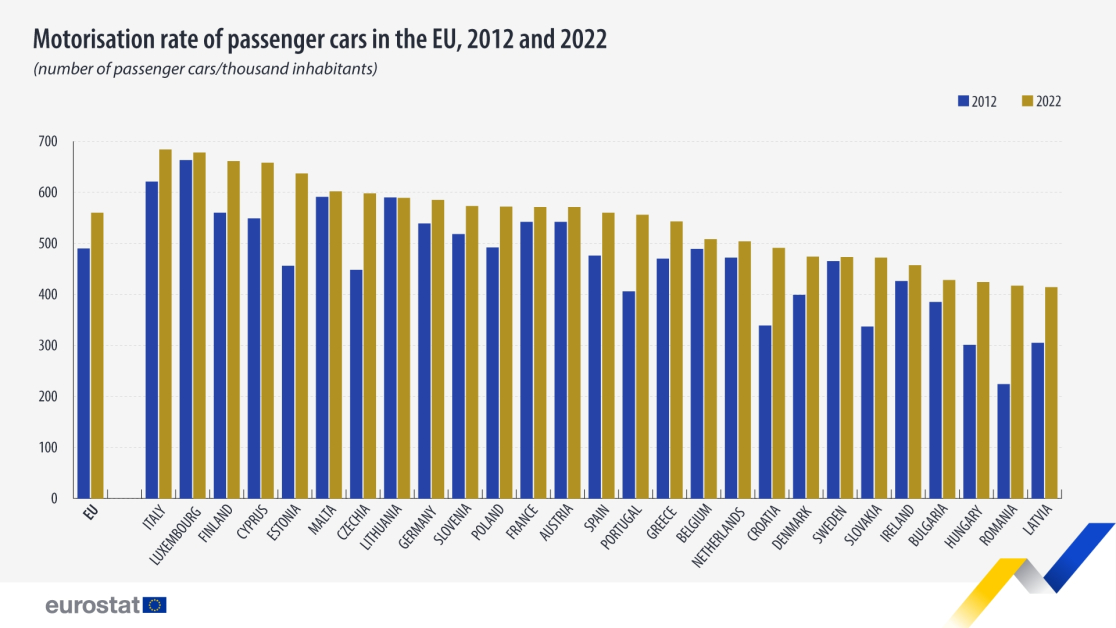 Средният брой на леките коли на хиляда поданици в Европейския съюз е 560 за 2022 година - нарастване от 14.3% спрямо 2012 година