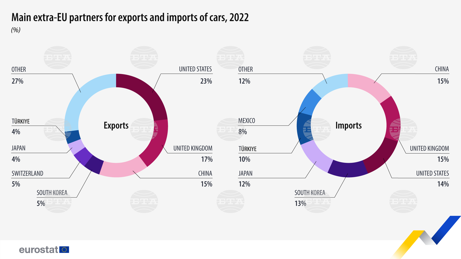 Китай и Англия са страните, от които са импортирани най-вече коли в Европейски Съюз през 2022 година (по 15 на сто), следвани от Съединени американски щати (14 на сто), Южна Корея (13 на сто), Япония (12 на сто), Турция (10 на сто) и Мексико (8 на сто). Тези страни обезпечават 88 на 100 от вноса на коли в Европейски Съюз.