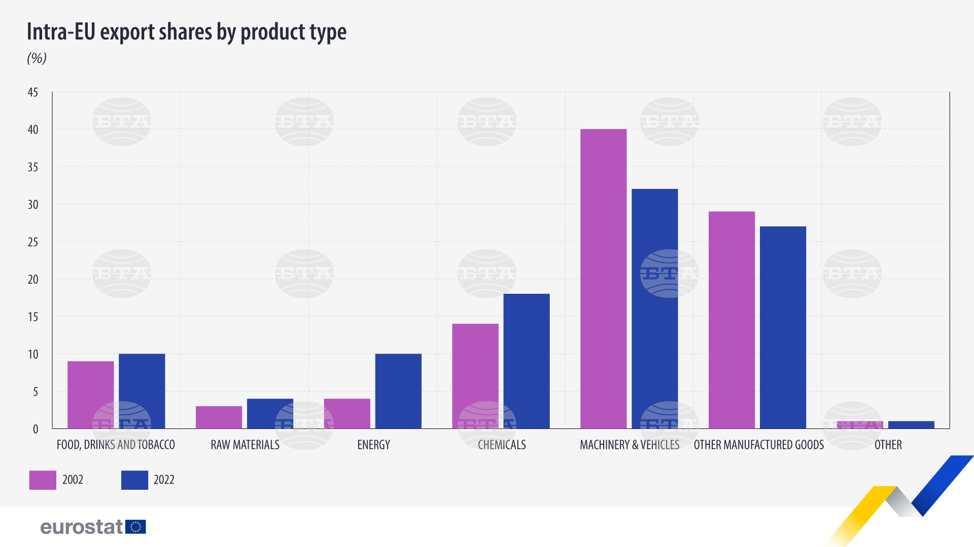 През последните две десетилетия (между 2002 година и 2022 г.) при вътрешнообщностния износ в Европейски Съюз най-вече нараства делът на енергийните артикули и химикалите, само че това нарастване значително може да бъде отдадено на повишението на цените им, регистрира Евростат.
